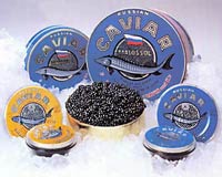 Pasteurized caviar. Caviar is put into glass jars, sealed, then placed in water baths at a constant temperature of about 60°C (140°F). The jars are normally labeled in the traditional colors: Sevruga with a red label, Oscietre with a yellow label and Beluga with a blue one.